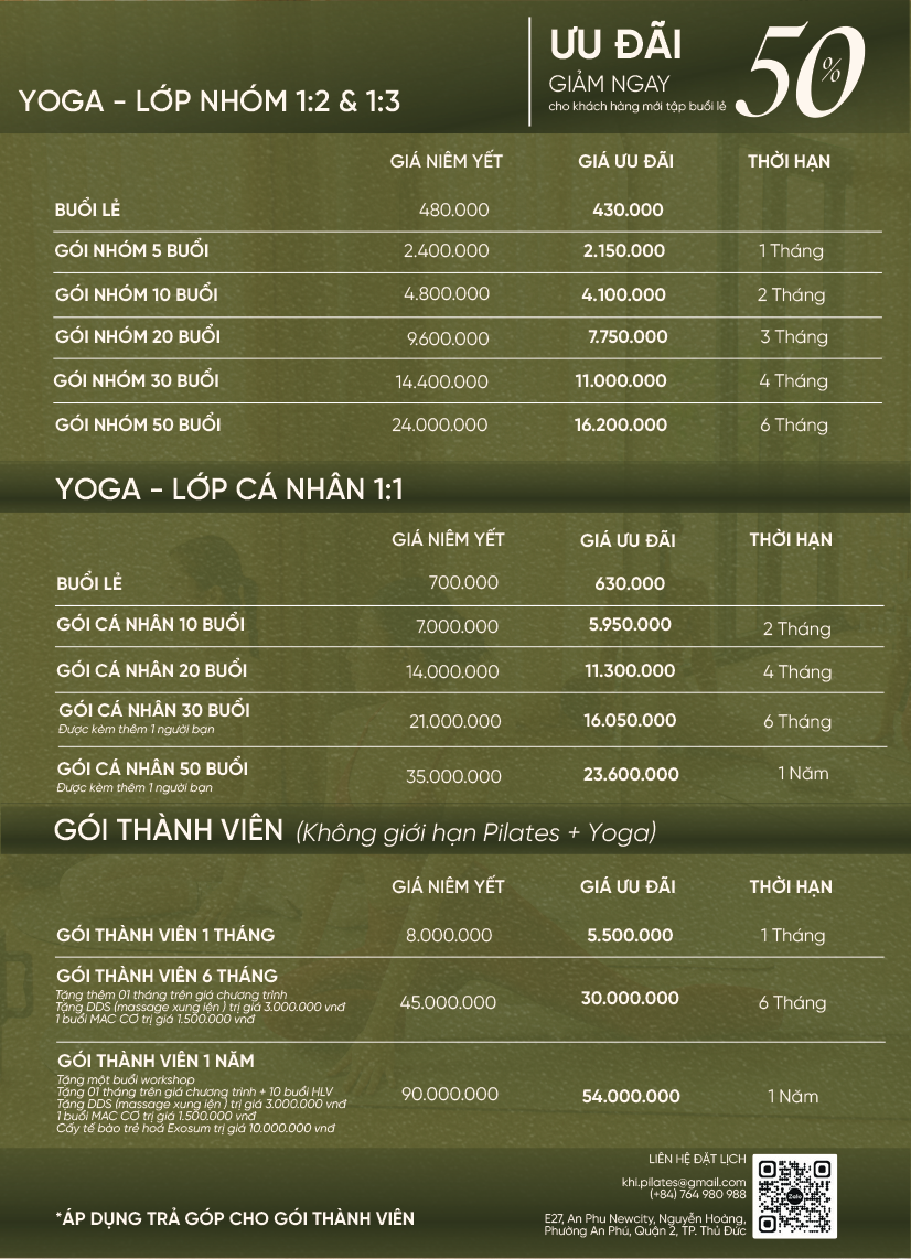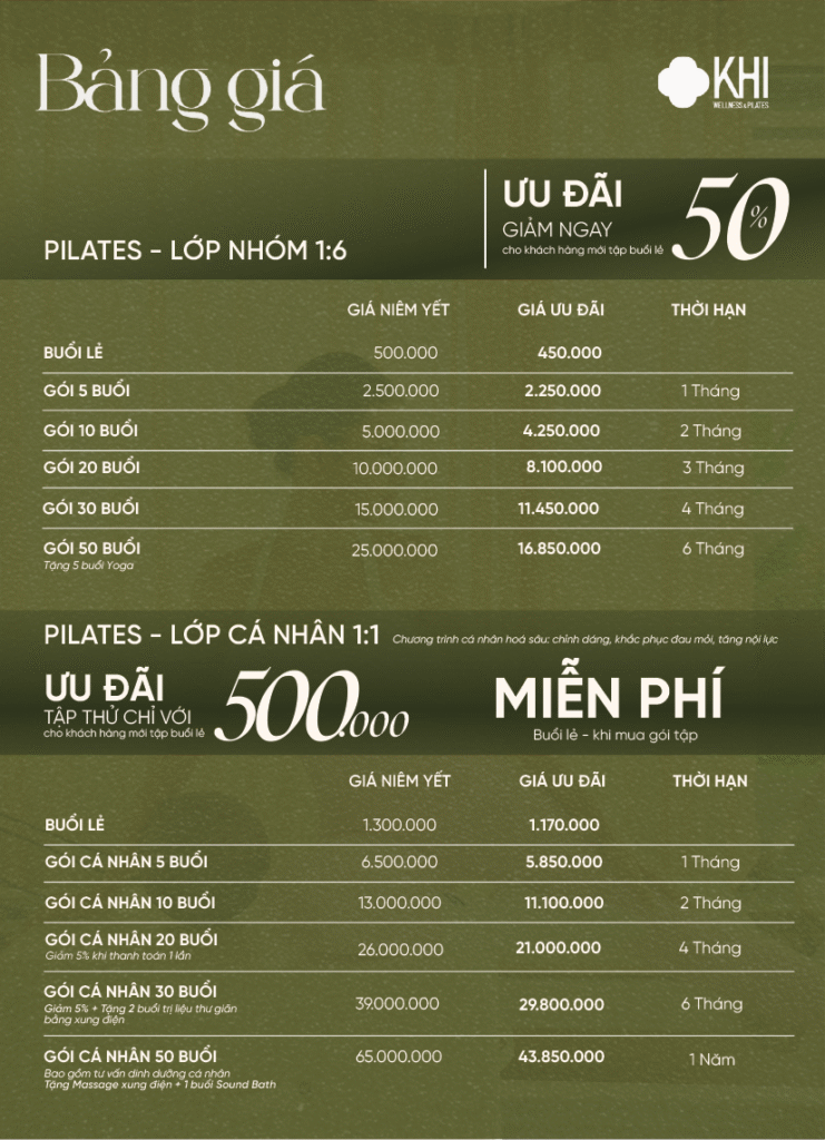 KHI Wellness mang đến hệ sinh thái chăm sóc thân – tâm – trí với Pilates, Yoga và các liệu pháp Energy Healing như Meditation, Breathwork, Sound Bath và Sauna. Mỗi dịch vụ được thiết kế giúp bạn cải thiện thể chất, thư giãn sâu và tái tạo năng lượng để trở về trạng thái cân bằng nhất của chính mình.